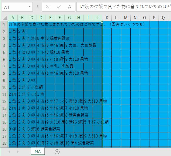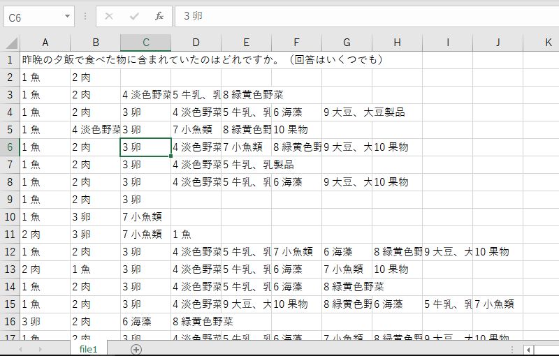 デフォルトで何もいじっていないならファイルをダブルクリックするとエクセルで勝手に開きます。エクセルで開いた画面は下記のように1選択肢1セルの形で格納されています。